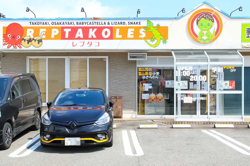 REPTAKOLES(レプタコ)は、富山市中川原にあるタコ焼きの店。大阪出身の店主が地元富山の食材にこだわり絶品のタコ焼きをご提供しております。タコ焼き以外にも、唐揚げやホルモン鉄板焼き、ベビーカステラなどを販売しており、店内飲食も可能です。また、店舗内の別区画で爬虫類(トカゲなど)を飼っております。爬虫類が好きな方はぜひご鑑賞ください。